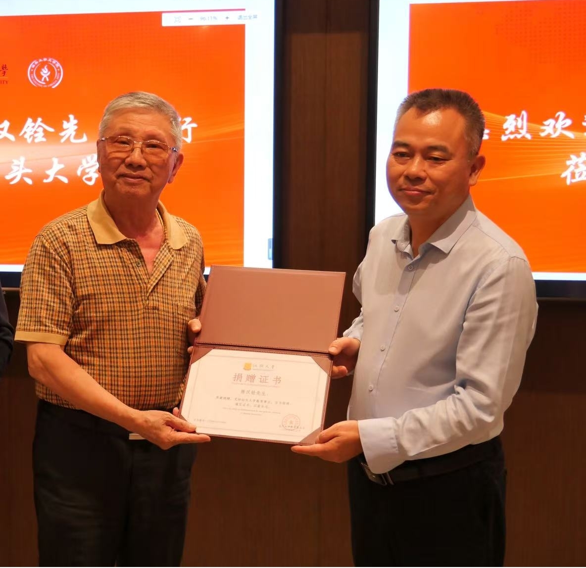 (汕头大学副校长胡忠教授为伍成晓先生颁发捐赠证书)